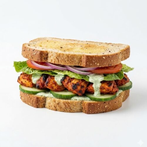 Spiced grilled paneer in toasted bread with fresh veggies and chutney.
